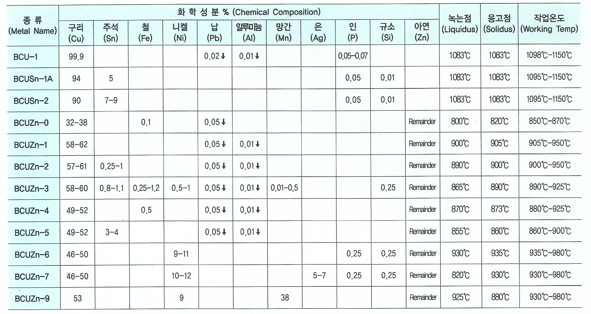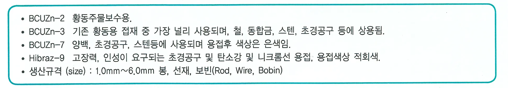 황동용접재란구리(50%~60%)와아연(35%~40%)합금으로주로철강재, 동, 동합금, 스텐에용접되며주석(Sn)을 첨가하여유동성을증가시키고, 니켈, 철, 망간, 은등을첨가하여기계특성, 모재와의 친화성등을 향상시킨합금입니다.
