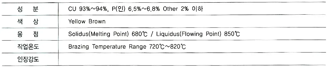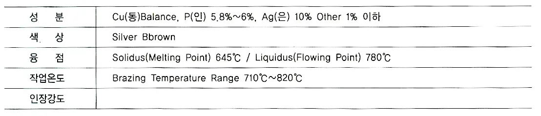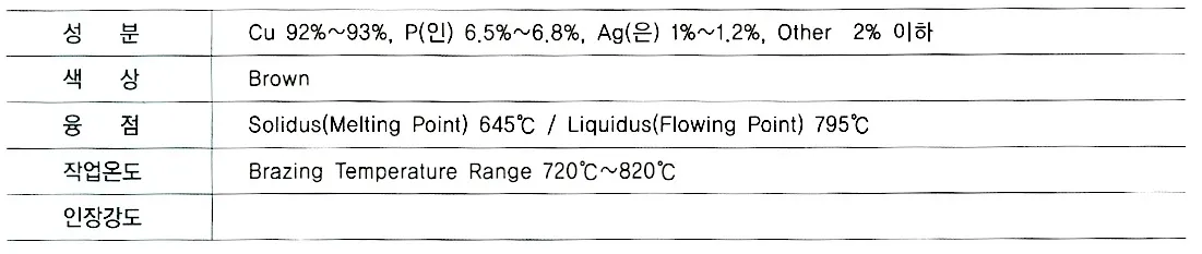 인동용접재는 구리, 인을 주체로 하고 은, 주석 등의 원소를 첨가한 합금으로 구리에 인을 첨가(4.5%~7.2%)하여 융점을 낮게하고, 은, 주석 등의 첨가로 유동성과 접착성, 기계적 성질을 향상 시킨 것입니다.