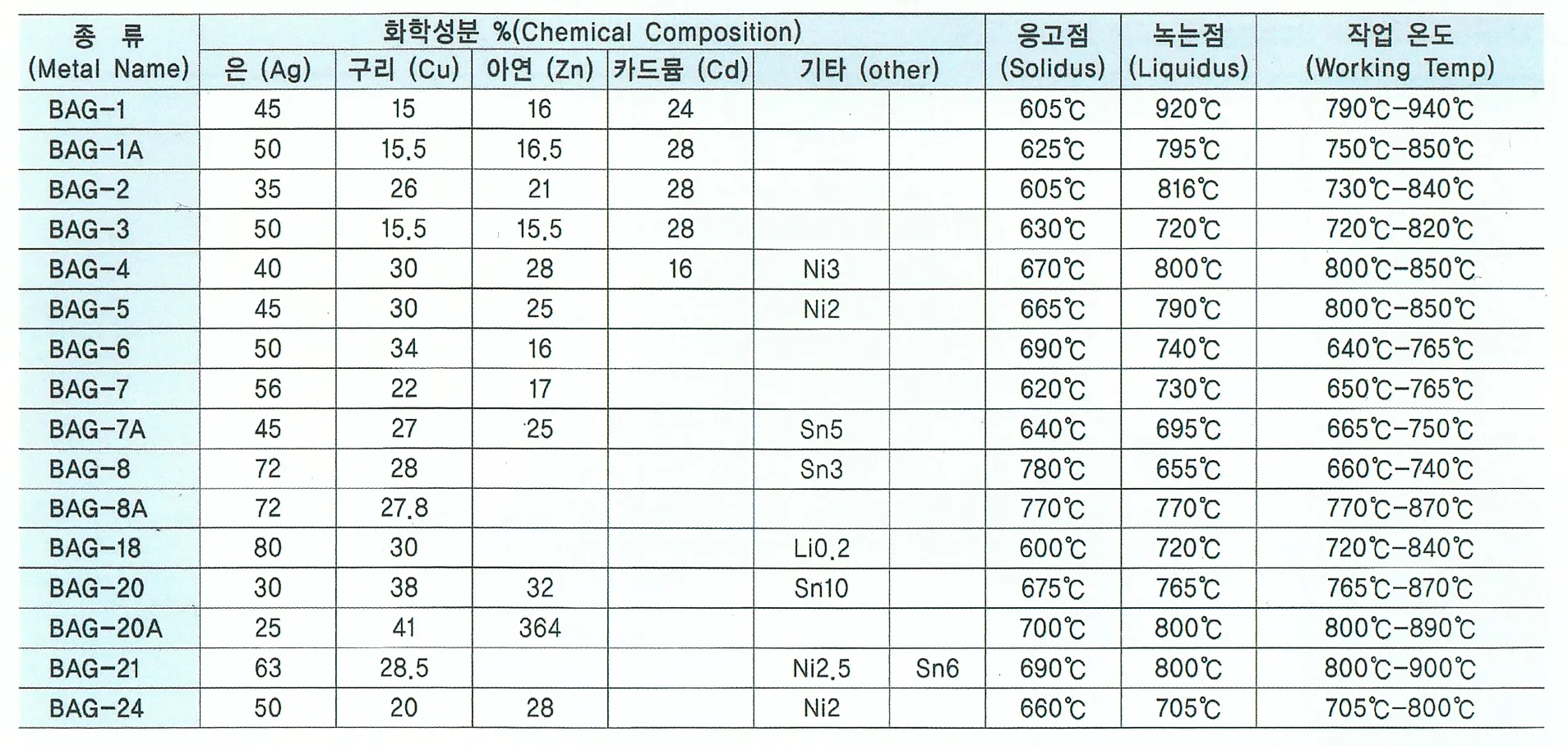 은합금용접재(BAg)는 은(25%~70%), 구리, 아연을 주합금으로 융점을 최저로 낮게한 합금으로 은함량이 높으면 유동성과 접착성, 기계특성 등이 향상됩니다. 스텐, 철강, 주조강, 티탄강, 동합금등 알루미늄을 제외한 모든 재료용점에 가능합니다.